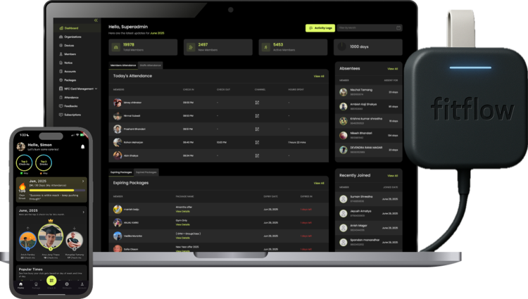Our device ensures secure access and attendance tracking. Experience the comprehensive FitFlow features to enhance your fitness management.